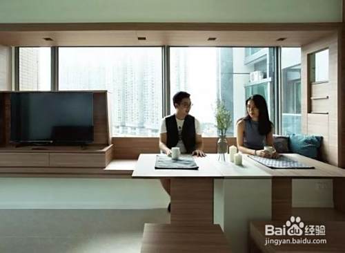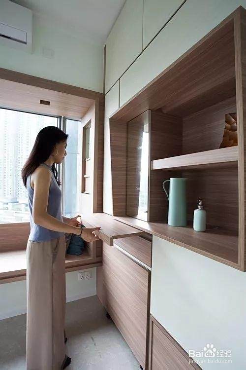 餐桌:隐藏在夹层内侧的一块木板变成了餐桌,窗台部分可以充当一个凳子,这样节省下了凳子的空间。