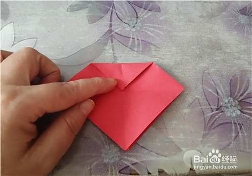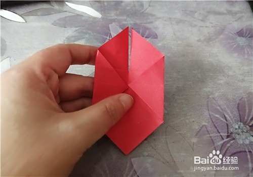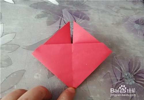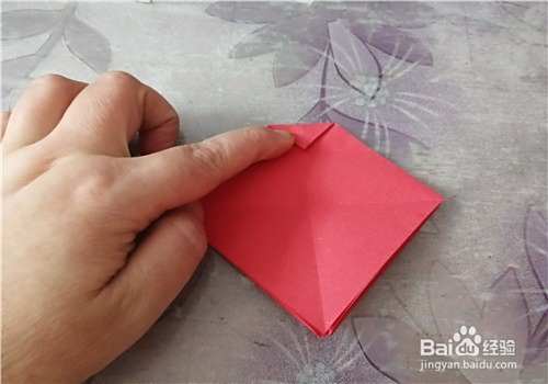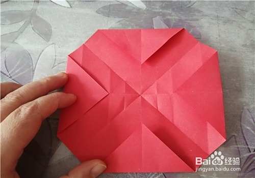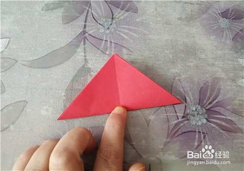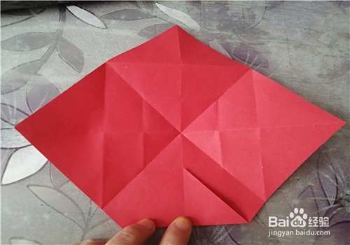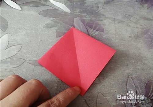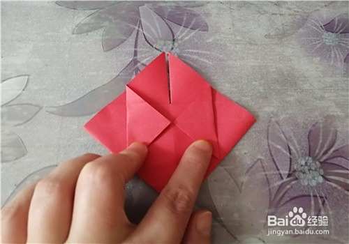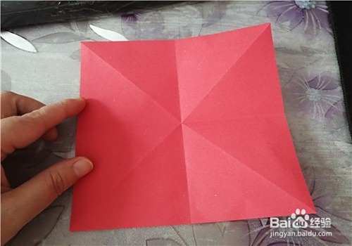 首先把纸的中间折出米字型,按照折痕把彩纸折成图二的样子。再把下侧的角向上折,如图三。