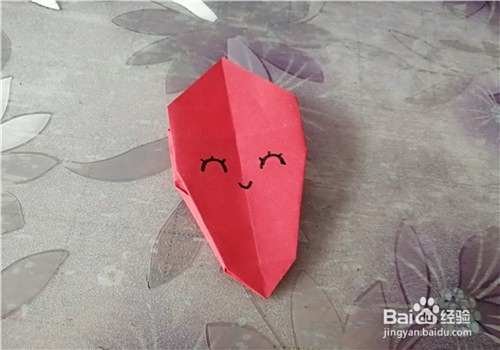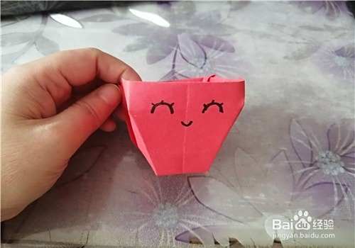 再把下面的两边分别向内折,是折痕之间的连线。如图一。后面的一样操作,翻到另一面,我们给杯子画上表情,如图二。