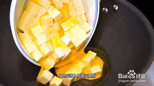 锅中加入适量的油,油热后放入鸡蛋豆腐煎,把鸡蛋豆腐煎至表皮金黄,捞出备用。
