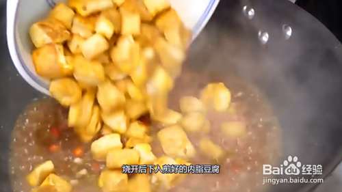 烧开后下入煎好的内脂豆腐,翻炒均匀后烧至三分钟把豆腐烧入味。
