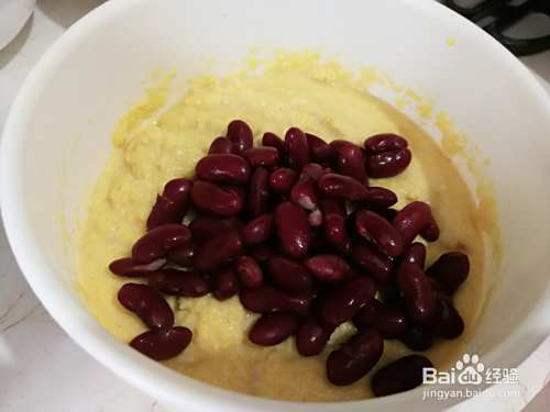 当面糊发酵到原面糊一倍大左右,面糊就发酵好了,放入适量芸豆搅拌一下。