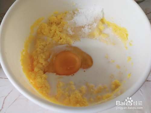 然后放入鸡蛋,牛奶,白糖,白糖可以促进发酵,鸡蛋和牛奶可以使做好玉米饼更松软。