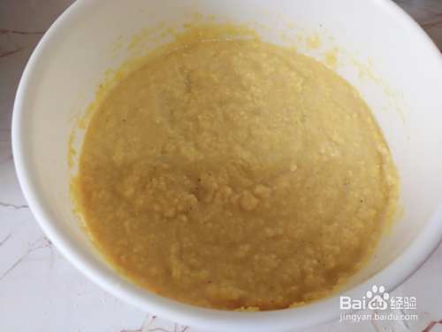 放入黄豆粉,放入黄豆粉是玉米饼松软好吃的关键,加适量温水搅拌成糊状,盖上盖发酵。
