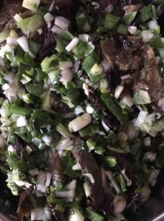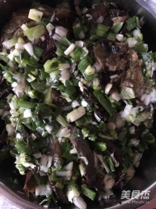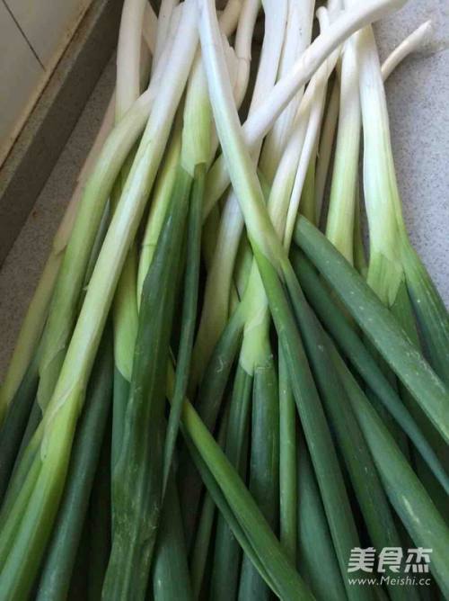 5大葱切碎,放入香油和盐,然后把拌好的葱一层一层加入茄子片内!