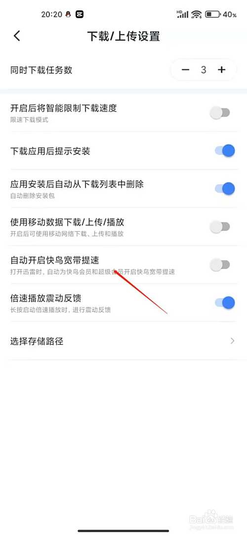 4、进入下载设置,点击自动开启快鸟宽带提速即可
