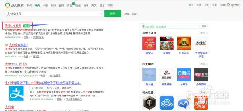 打开浏览器,搜索“支付宝登录”,选择蓝色箭头标注的网页,点击进入。