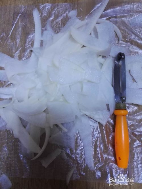 用刀将萝卜刨成细片。
