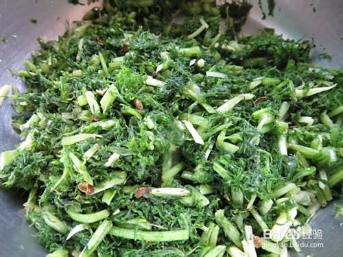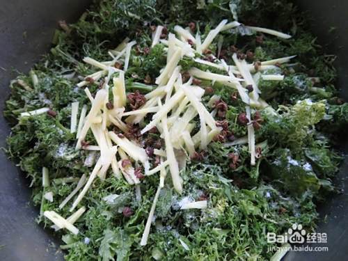 将芥菜放入大盆中,放入姜丝、花椒和盐