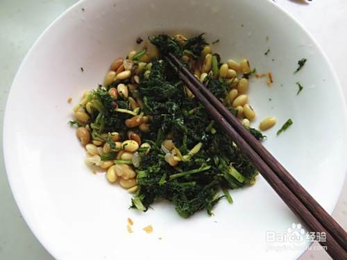 取少许腌制好的芥菜与黄豆一起放入碗中加少许盐煮熟