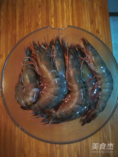 黑虎虾自然解冻后开背去除虾线,放入料酒,胡椒粉,盐,静置20分钟。