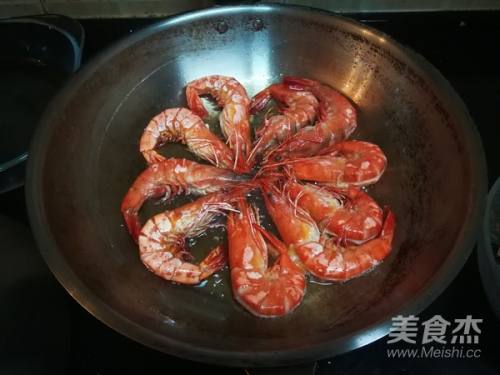炒锅放花生油,油热放黑虎虾煎制虾壳变色,并发出香味,捞出备用。