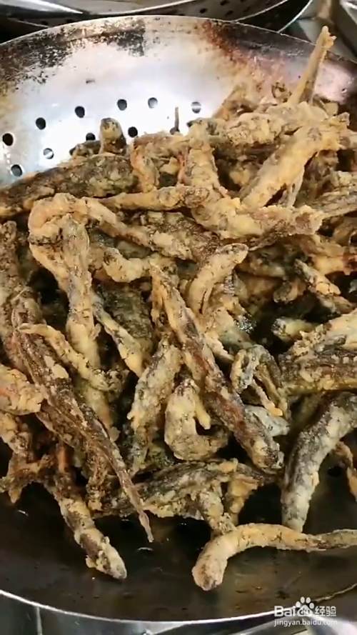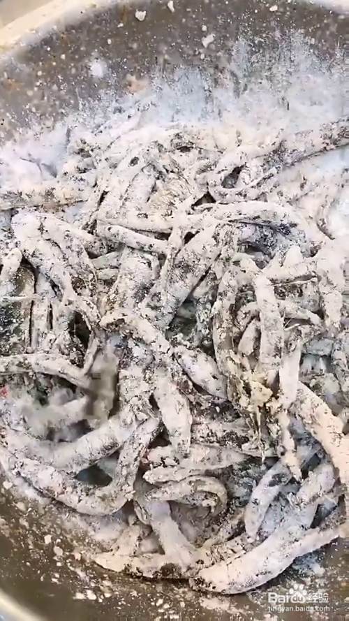 接着在泥鳅鱼中拍入淀粉,均匀地裹上一层淀粉后锅中烧油,油温烧至五到六成热,放入泥鳅鱼炸至干香捞出控油备用
