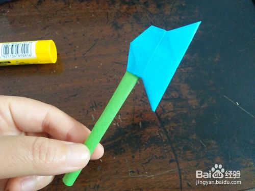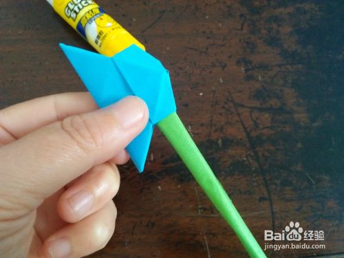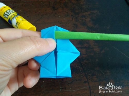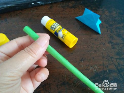 再把彩纸从中间对折,我们用长方形的彩纸卷成一条长棍,用胶棒把边缘粘住,插进先前的折纸里。