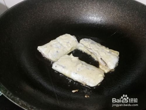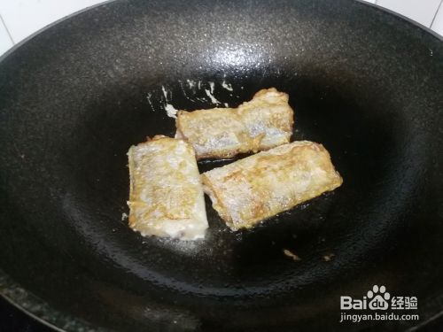 不粘锅倒入食用油,烧至八分开,放入鱼段煎制,煎好一面,翻过来煎制另一面。