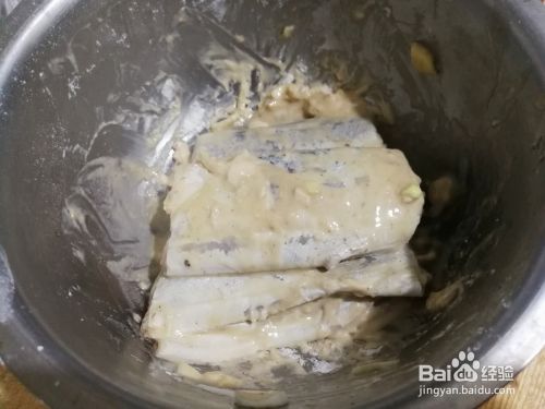 放入适量 面粉,使鱼段均匀裹上一层面糊。