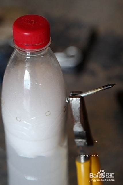 3、 找根稍粗的铁钉,在高水位下方约3-5CM处打几个孔,瓶子穿孔位置不宜太高,太高洗涤液流出量太少;也不宜太低,太低还没等瓶内洗涤液流出,外界注水已经淹没,均不能达到稀释的目的。