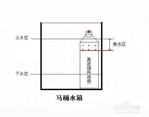 如下图所示,平时马桶水箱里的水在“上水位”处,冲洗后在“下水位”处。我们把装有“高效浓缩洗涤液”的瓶子立放在水箱中。冲洗时,水位开始下降,当水位降至瓶子孔眼以下的时候,由于瓶盖是通气的,瓶子中的洗涤液由于重力会自动顺着孔眼漏入水箱中。马桶冲洗水量大,很快降至“下水位”处,水箱停止排水,外界供水系统开始注水,这个时间过程中,瓶子仍在在渗漏,直到水位超过“红线”时,水箱水位高于瓶内,开始往瓶内灌水,最终到“上水位”处停止供水。这时,水箱内是“低浓度的洗涤液”,瓶内是“稀释过的洗涤液”,两者水位处于同一水平。下次使用时一如既往,不断的换水稀释瓶内的洗涤液,直到用尽(可以继续加注)。这些洗涤液冲洗马桶效果要比清水好多了,除垢去异味。另外每次冲洗时,瓶内红线以下的水是流不出来的,始终占用了水箱的部分空间,冲洗马桶的实际冲水量就减少了,从而达到了节水的目的。