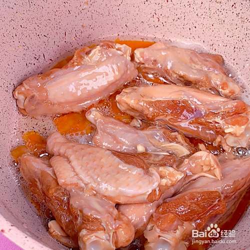 再放入腌制好的鸡翅,翻煎至表面金黄。
