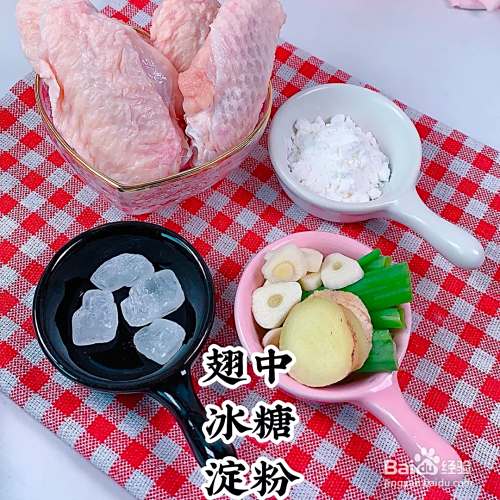 准备食材:鸡翅中、冰糖、淀粉、葱姜蒜。