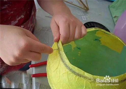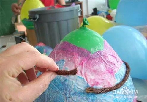 晾干后,剪掉气球上方部分,安装上铁丝提手。