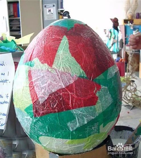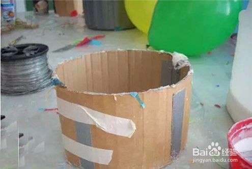 气球吹起来后,放置到纸筒上。把皱纹纸裁剪后用白乳胶贴到气球上。
