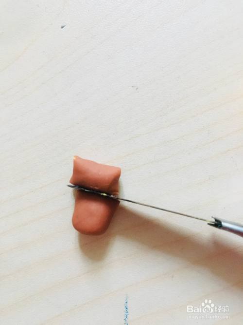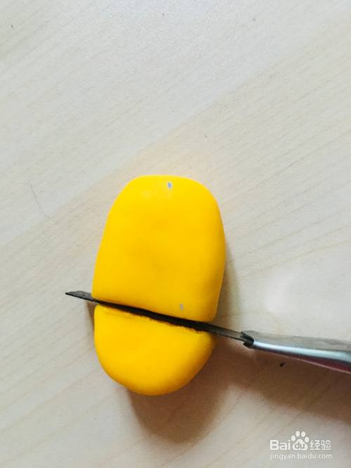 取黄色橡皮泥搓成长条,用平板压成四方形,然后用刀片切去一部分。