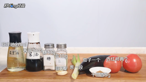 1准备20毫升花生油、10毫升酱油、10克盐、10克糖、2瓣蒜、一段葱、一个茄子、5克十三香、2个西红柿。