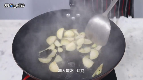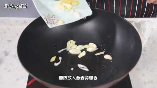4锅中倒入花生油,油热放入葱姜蒜爆香。