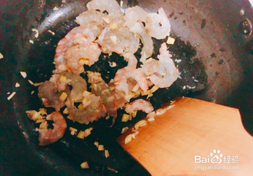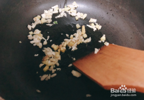 小火,油一点点热时,放入蒜末和姜末,炒出香味