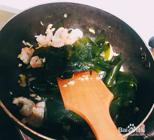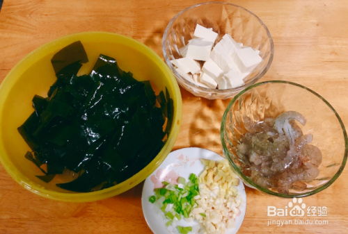 海带洗干净,姜、蒜泥、葱切成沫,虾剥壳