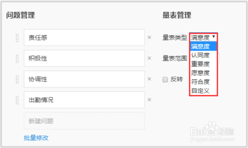 Step 2、编辑题目选项内容,“问题管理”为矩阵量表题的纵向坐标内容,“量表管理”为矩阵量表题的“量表类型”与“量表范围”。