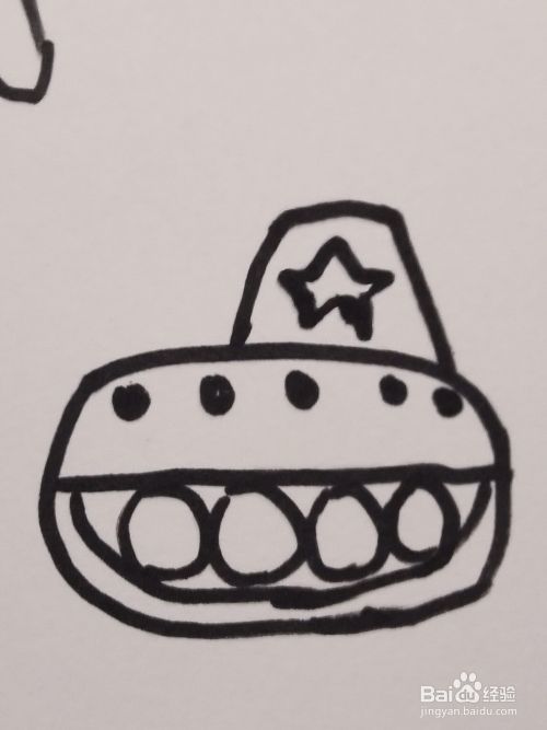 画完坦克的下半身后,接着画出它的上半身的底座,画出一个五角星做装饰