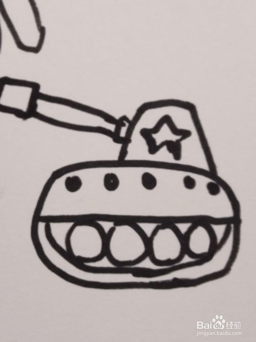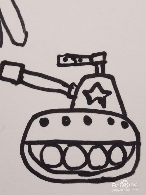 画完装时候,接着画出坦克的炮筒,像一个细长的管状,再接着画出坦克盖子的天线,坦克就画好了。