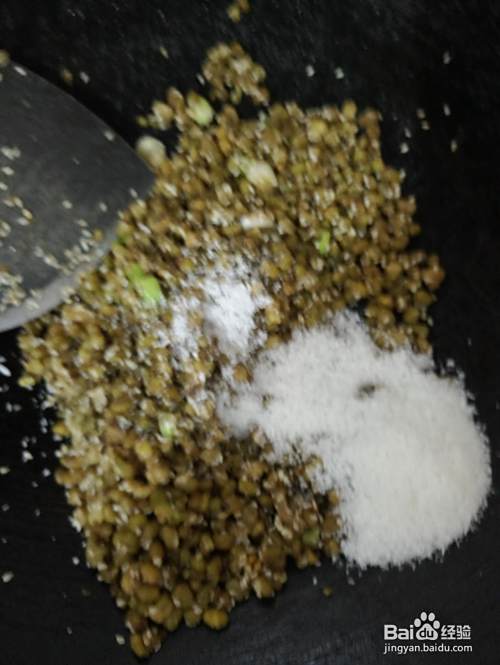 将椰蓉放入翻炒一下,直至闻到了椰蓉味道了,就加入炒好的白芝麻,继续翻炒,直至白芝麻与绿豆都搅拌均匀了即可停火。这样美味的椰蓉绿豆馅就好了。接下来就可以做糕点了。
