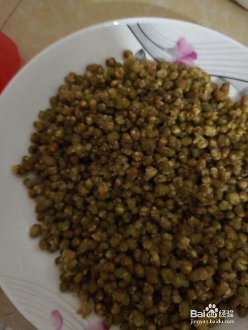 把煮好的绿豆倒入炒锅内,小火慢慢炒一下,如果觉得绿豆干的话,则再放入花生油,直至看到绿豆上看到有点点光泽了。