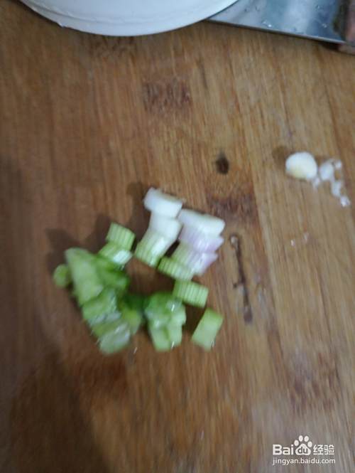刚炒过芝麻的锅加热,然后放入花生油,油热后,放入切断的葱白,炒到葱有香味了。