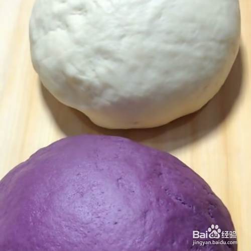 同样的方法和一个白色的面团,醒发20分钟。分别擀成薄饼,