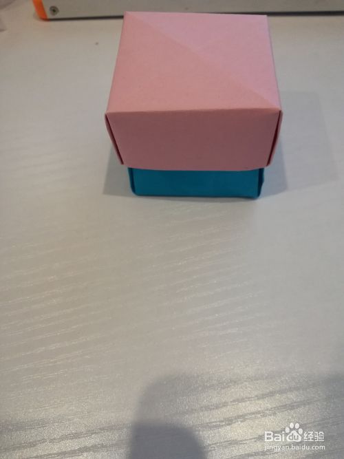 四个角都折好之后,一个礼品盒子就做好了,可以将我们需要放置的礼物放进去,然后开始制作礼品盒子的盖子。取另外颜色的一张折纸,这样做出来的效果更加好看。将折纸向中间折叠。