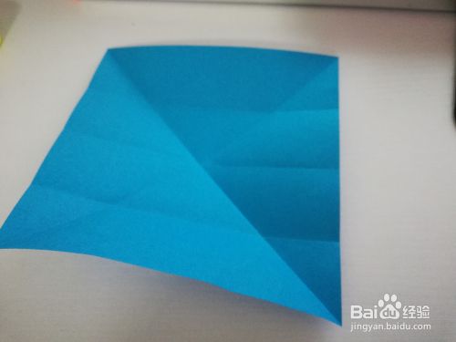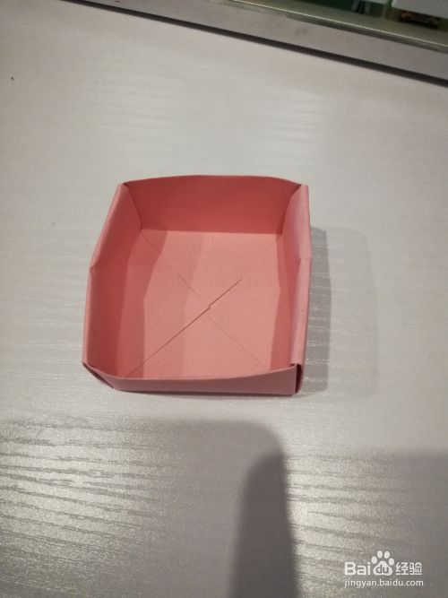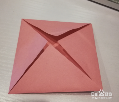 打开折纸将四个角分别往中间折叠,每个角的顶点和折纸的中心点对齐,折好之后将折痕按压的更明显,再打开,两个边往中间折叠,全部打开之后,沿着折痕,将一个角压到盒子中间,另外两个角成如图所示状态。