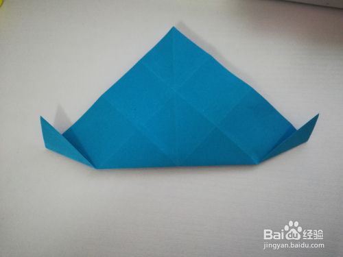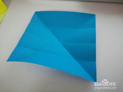 把折纸整个完全打开,刚才折的小三角形折痕两边分别往里面折,将上方的小三角形压在这好的这两个褶皱之上,同样的方法,将四个角同时做这样的处理。