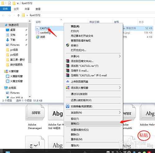 然后回到解压目录,把你有的字体复制了,回到电脑安装字体处,直接粘贴就完成了。