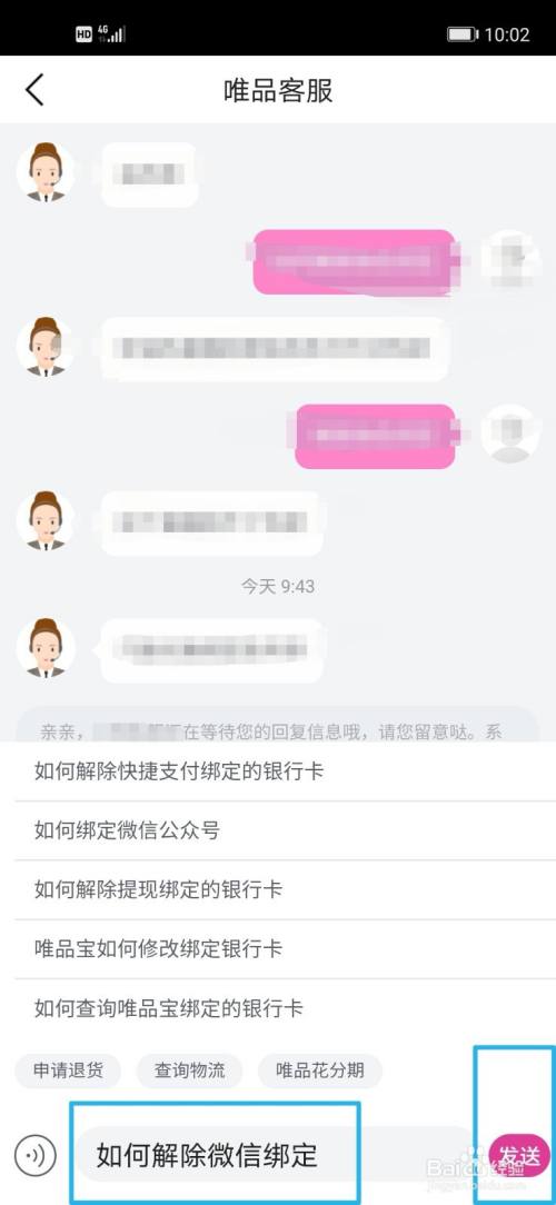 点击在线客服,如下图,输入解除微信绑定,看到发送