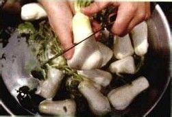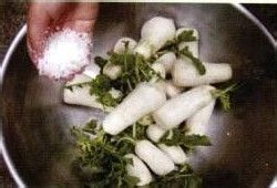 把2~3个小萝卜和葱一起捆起来,这样取出来吃时比较方便,吃的时候可以拿出一捆,把小萝卜和萝卜缨分开切成适当的大小盛入碟中时就更是省时省力啦。
