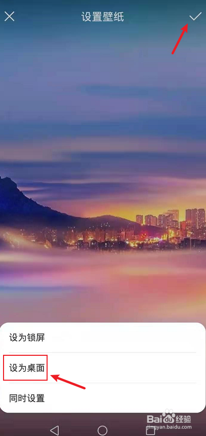 在壁纸页面,点击右上角的打勾,再点击“设为桌面”。
