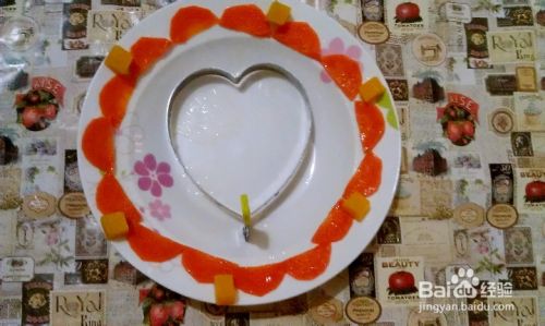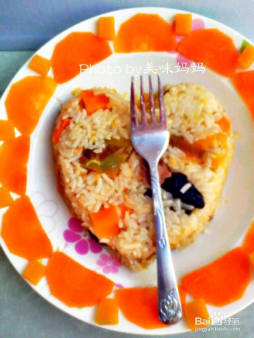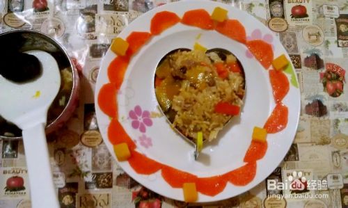 将剩下的胡萝卜片和南瓜丁放奶锅里加入一勺盐和食用油焯下。依次摆在盘子上放,然后在盘子中间放一个心形模具,将煮好的米饭用勺子整实,取掉模具即可。