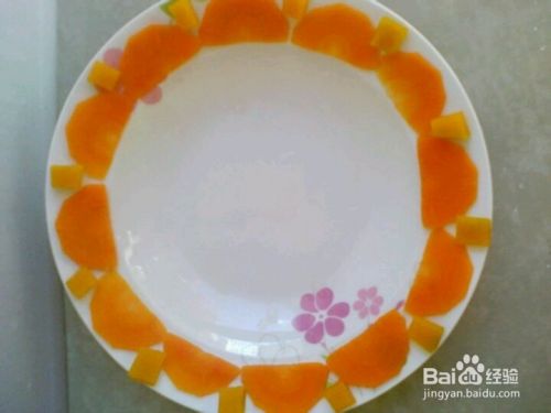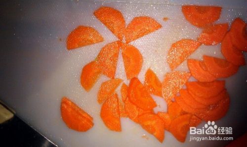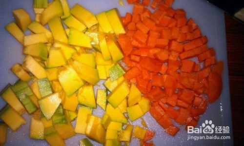 将胡萝卜和南瓜去皮,分别切成丁。然后一小段胡萝卜对半切开切成薄片用来摆盘用。