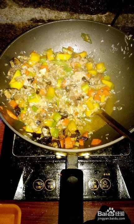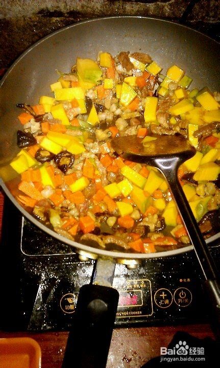 将胡萝卜、南瓜丁、干贝放入锅中一起翻炒片刻再倒入大米炒匀加入一勺盐和鸡精。