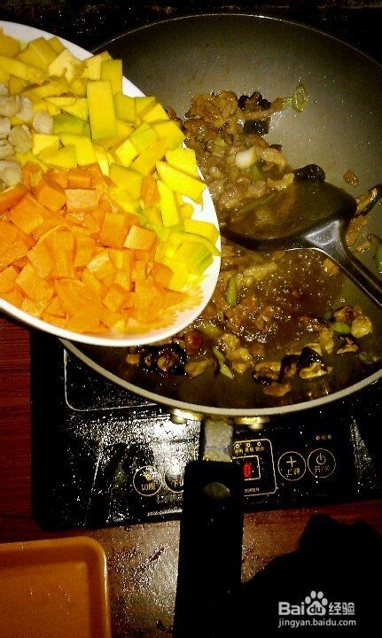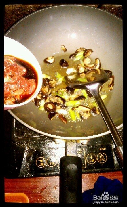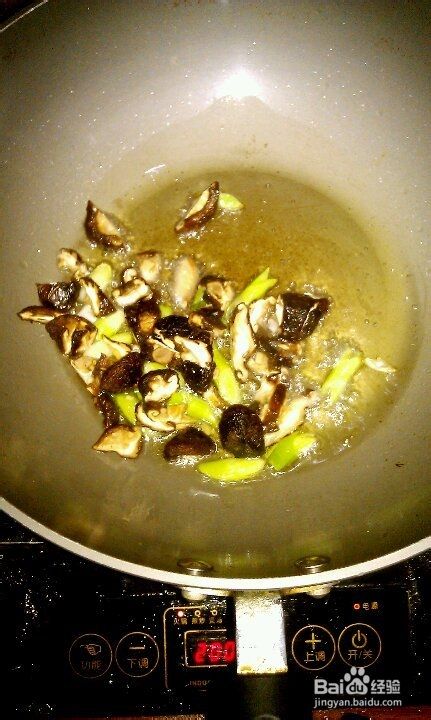 锅里倒点底油,葱段爆香放入香菇丝煸炒出香味,再倒入腌制好的肉丁翻炒2分钟。