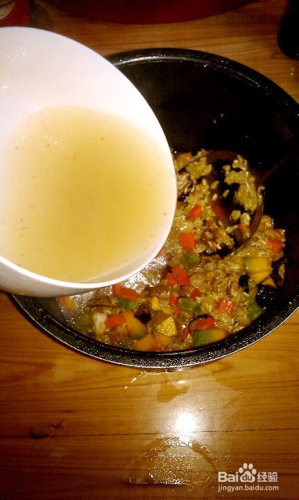 将炒好的大米倒在电饭煲胆里,准备一大碗排骨高汤没过米饭。按煮饭键煮到自动跳开即可。